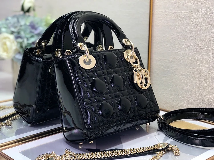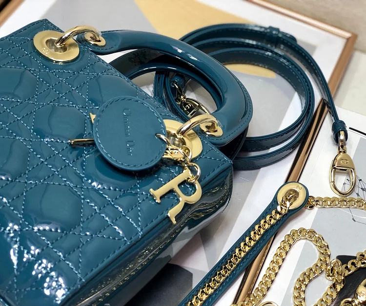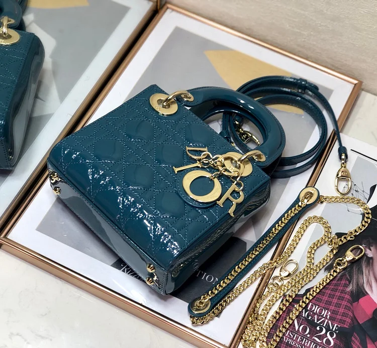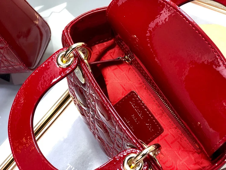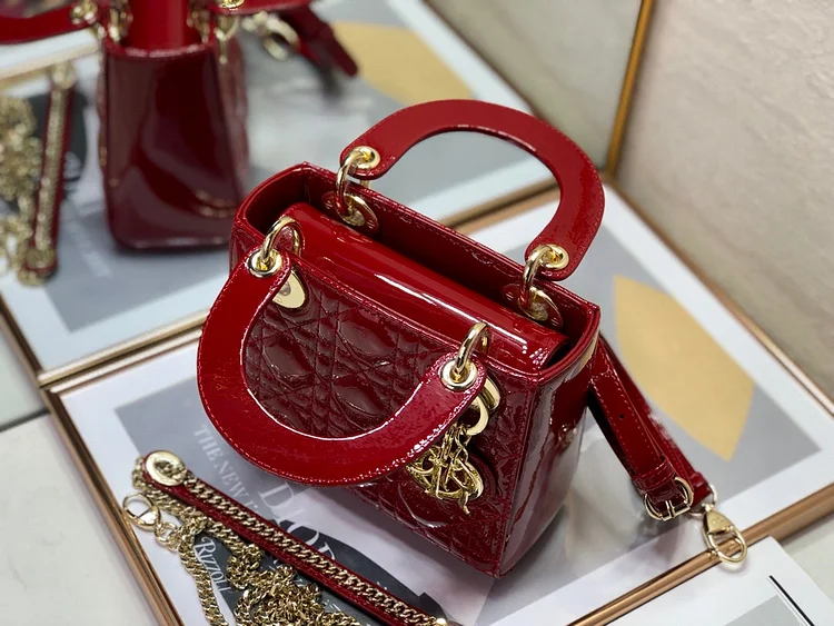The Lady CD My ABCCD bag epitomizes CD’s vision of elegance and beauty. Sleek and refined. the timeless and modern style is crafted in cherry red patent calfskin with Cannage stitching. creating the instantly recognizable quilted texture. Pale gold-finish metal ‘D.I.O.R.’ charms further embellish its silhouette with an elegant allure. The small style features a thin. removable leather shoulder strap and can be carried by hand. worn over the shoulder or crossbody.