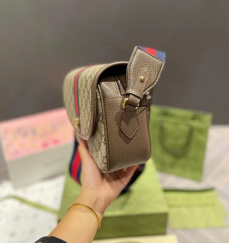 The Ophidia is reinvented in new and unexpected ways. Reminiscent of the punk scene. metal eyelets and studs define the historical silhouette to create a one-of-a-kind take on the archival style. Creating a playful contrast. the mini-sized shoulder bag is crafted from the House’s signature GG Supreme canvas in the traditional color combination of beige and ebony.