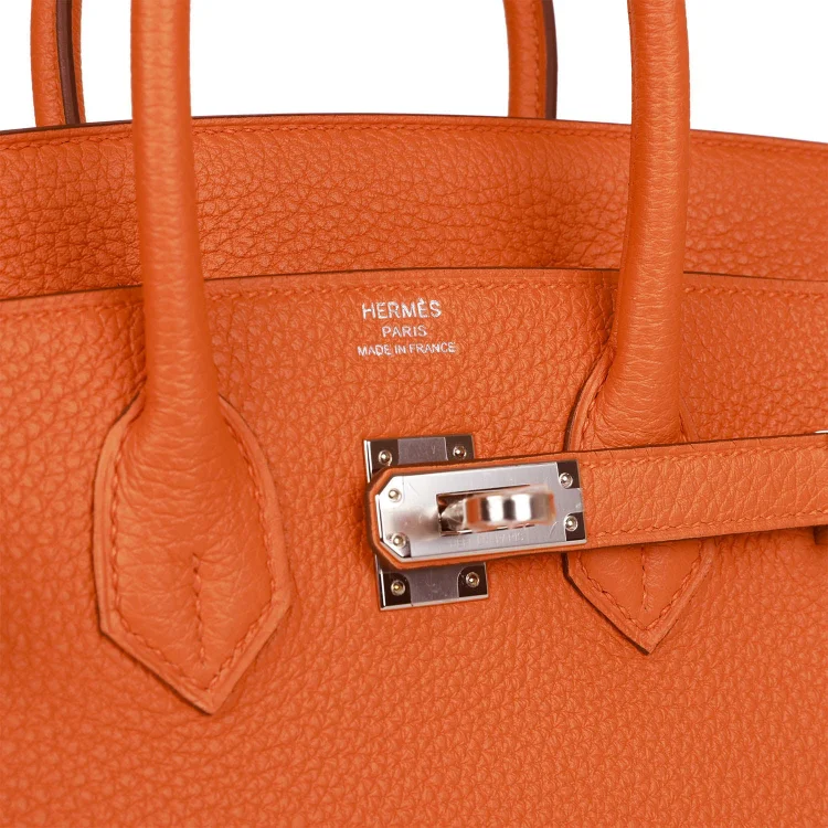 This Birkin is inOrangetogo leather with palladium hardware and hastonal stitching.front flap. two straps withcentertoggle closure. clochette with lock and two keys. and double rolled handles.