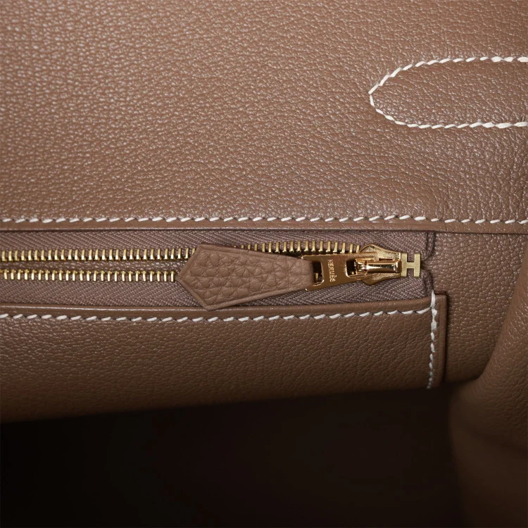 This Birkin is in Etoupe togo leather withgold hardware and has contrast stitching.front flap. two straps withcentertoggle closure. clochette with lock and two keys. and double rolled handles.