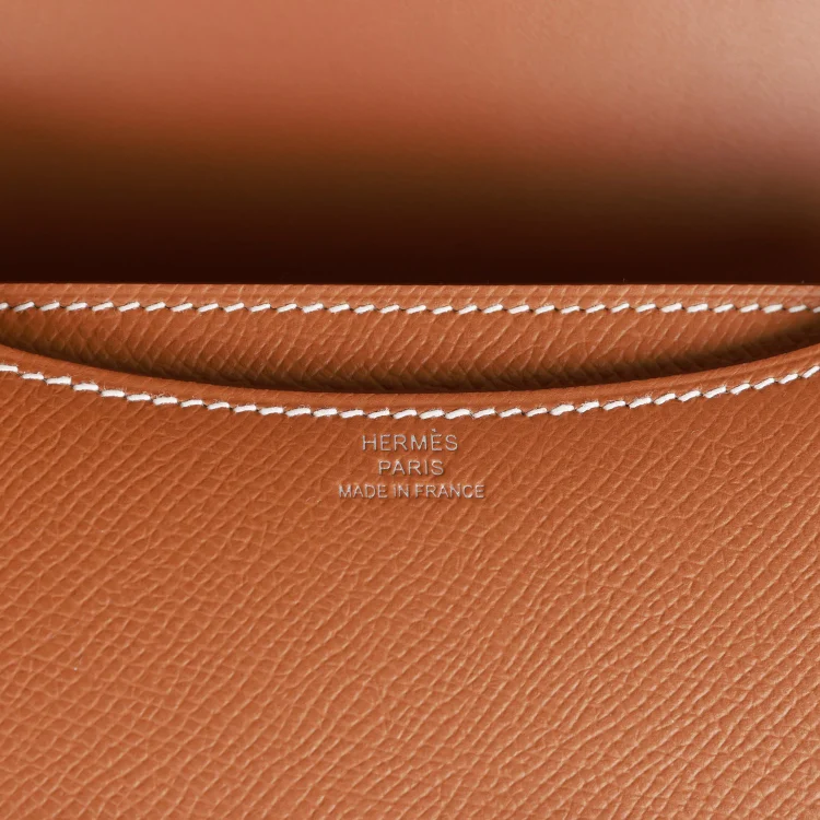 This Constance is inGold epsom leatherwithpalladium hardware and hascontrast stitching. ametal ‘H’ snap lock closure and adjustable shoulder strap.