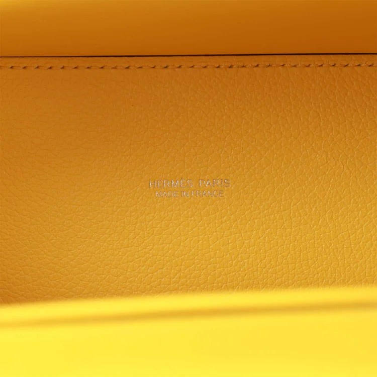 The interior is lined withLime lambskin and has a removable H stamped base and an open wall pocket.