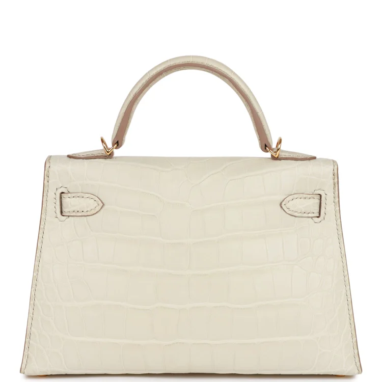 This tiny Kelly. in the Sellier style. is inBeton matteMississippienis alligator withgold hardware andhastonal stitching. two front straps with front toggle closure. single rolled handle and removable shoulder strap.