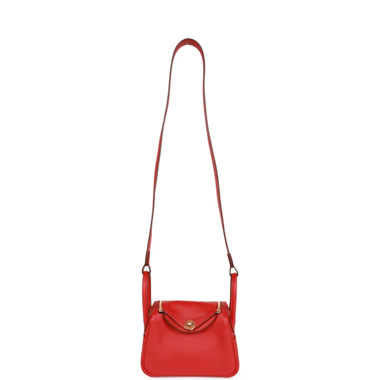This Mini Lindy is inRouge Piment swift leather withgold hardware and has tonal stitching. double zipper pulls. front Hermès twist lock. single pocket on each side. two rolled top handles linked by a flat shoulder strap.