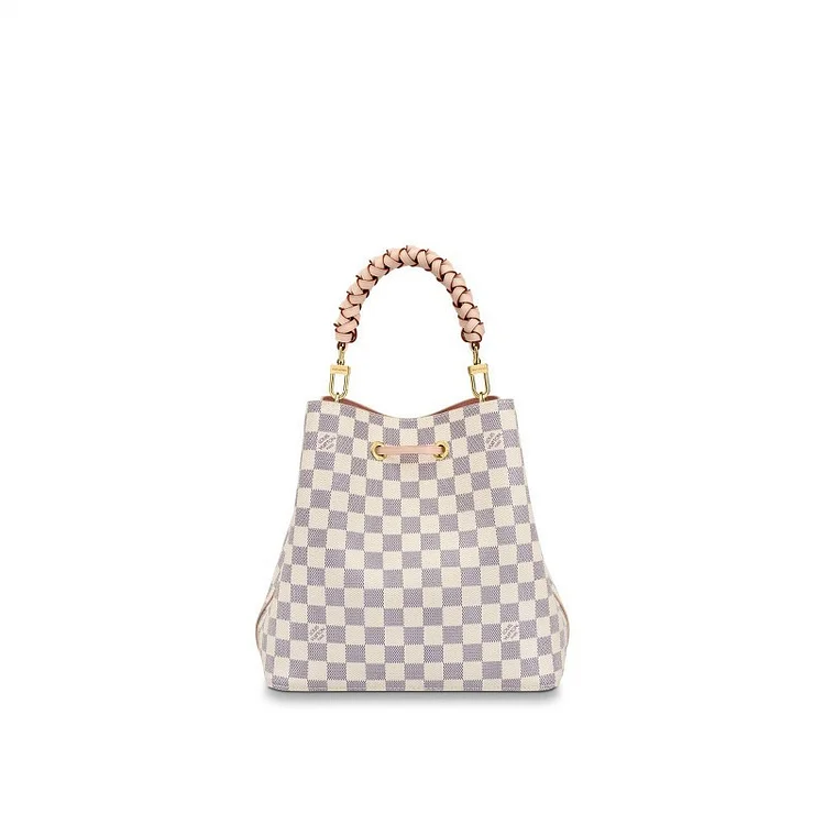 For Summer 2020. the NéoNoé bucket bag in Damier Azur canvas features a braided-leather top handle. The hand-painted edge-dyeing of the top-handle leather is a gauge of the House’s commitment to craftsmanship. It can be hand-carried or worn over the shoulder and cross-body. with its bicolor. removable leather strap.