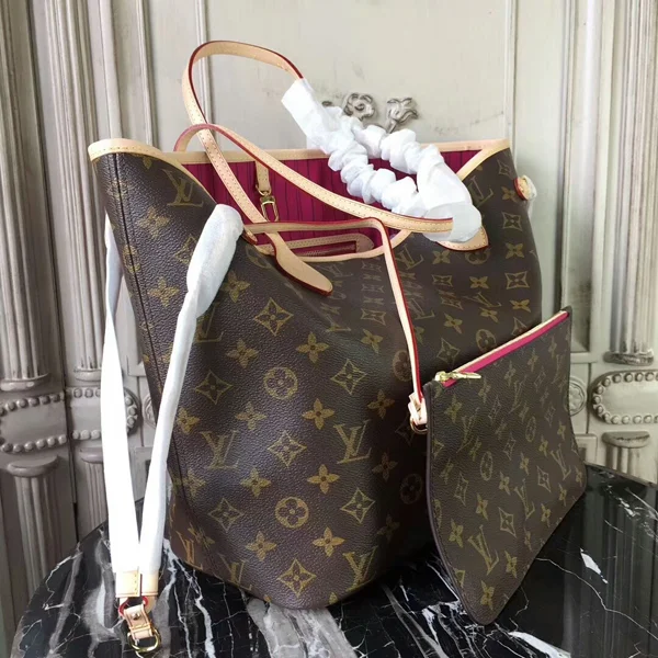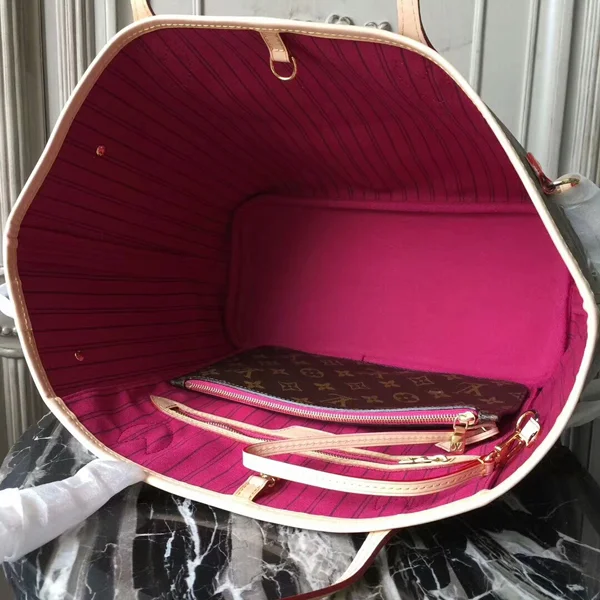 L celebrates the Neverfull with a new version of this iconic bag. Look inside to discover a host of refinements. The redesigned interior features a fresh textile lining and heritage details inspired by House archives. Best of all. the removable zippered clutch can be carried separately as a chic pochette or serve as an extra pocket. Linings in a selection of bright shades lend a pop of vivid color to the timeless Monogram canvas.