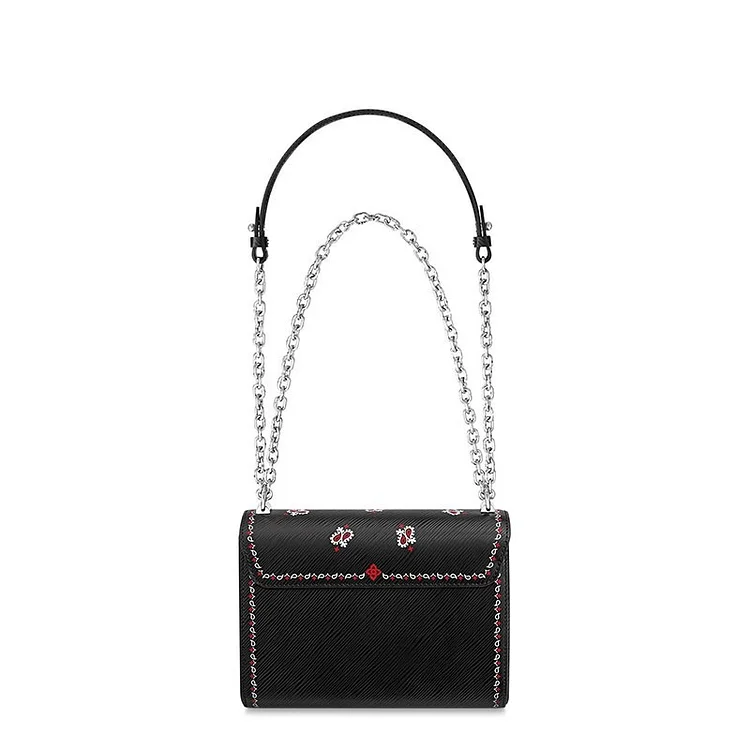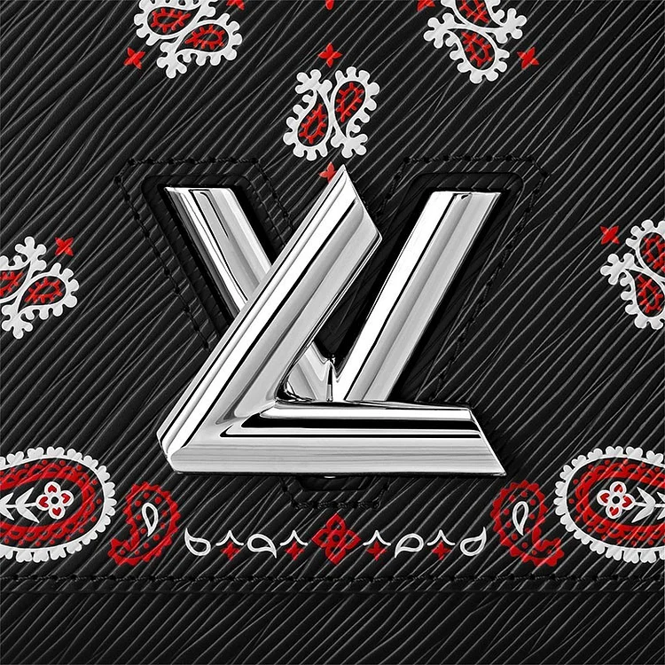 L reinvents the flowers and arabesques of classic paisley on this Twist PM handbag. Printed on the supple Epi leather. the bandana-inspired pattern complements the bag’s classic lines. The silver-color twist-lock opening and sliding chain anchor the bag in glamourous Twist territory.