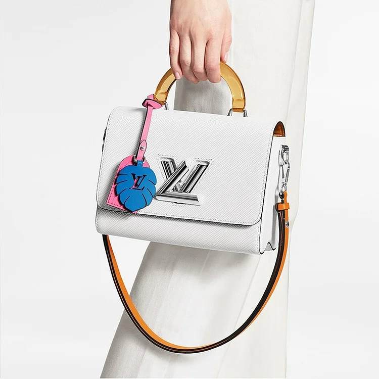 Transforming a classic bag into something bold and colorful for Summer 2020. L fashions the Twist MM in deep-dyed Epi leather with a colored plexiglass top handle and bright-colored nametag and charm. Accented by the classic Twist lock. the sheer top handle is associated with a removable leather strap for allow added carrying options.