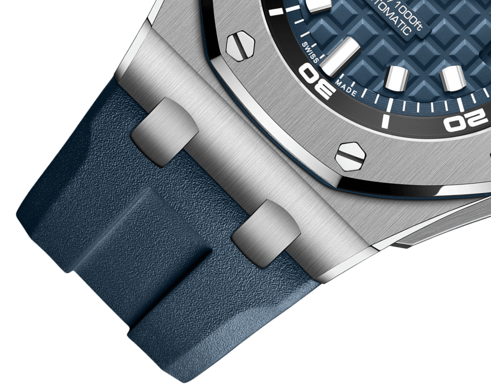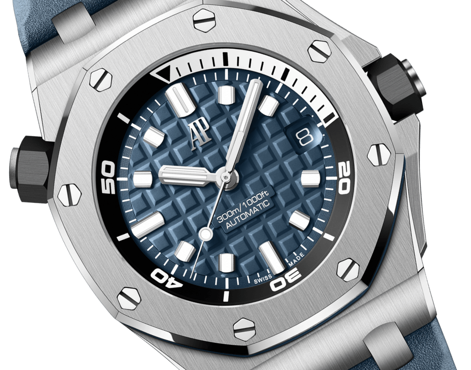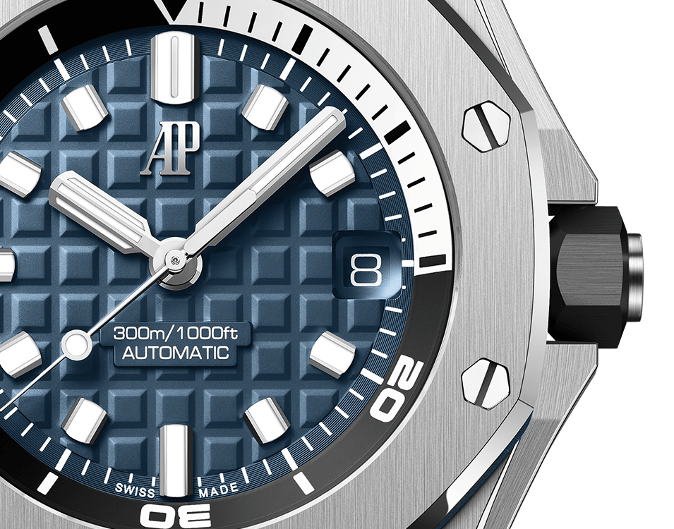 Blue dial with “Méga Tapisserie” pattern. white gold applied hour-markers and Royal Oak hands with luminescent coating. black rotating inner bezel with zone from 60 to 15 minutes in white