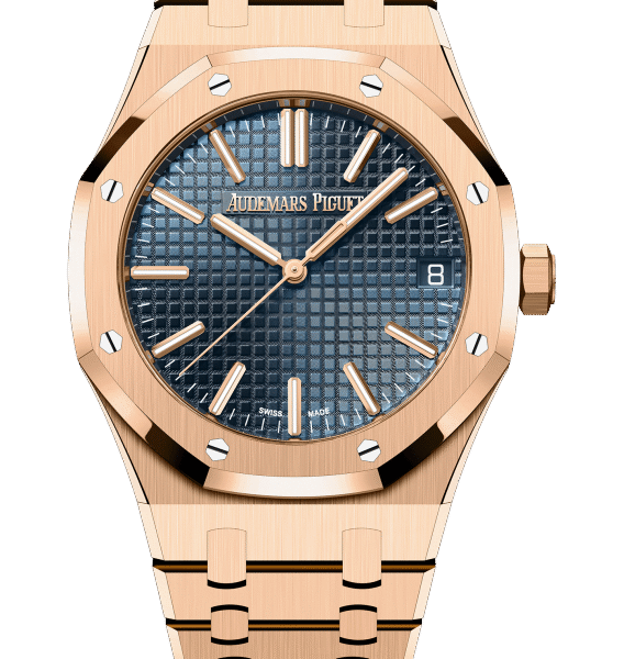 Orange dial with “Méga Tapisserie” pattern. white gold applied hour-markers and Royal Oak hands with luminescent coating. blue rotating inner bezel with diving scale and zone from 60 to 15 minutes in orange