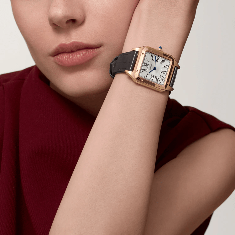 Santos-Dumont watch. large model. high autonomy quartz movement (~ 6 years). 18K rose gold (750/1000) case. beaded crown set with a cabochon-shaped sapphire. satin-brushed silver dial with sunray effect. Roman numerals. blued-steel sword-shaped hands. sapphire crystal. Strap in gray alligator leather. with 18K rose gold (750/1000) ardillon buckle. Case dimensions: 43.5 mm x 31.4 mm. thickness: 7.3 mm. Water-resistant up to 3 bar (approx. 30 meters/100 feet).